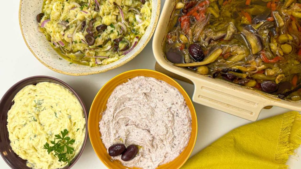 Vai receber amigos em casa? Que tal servir diversas pastinhas e antepastos e montar uma bela mesa? Aqui te ensino a fazer antepasto de berinjela, maionese caseira, pastinha de bacalhau e punheta de bacalhau.