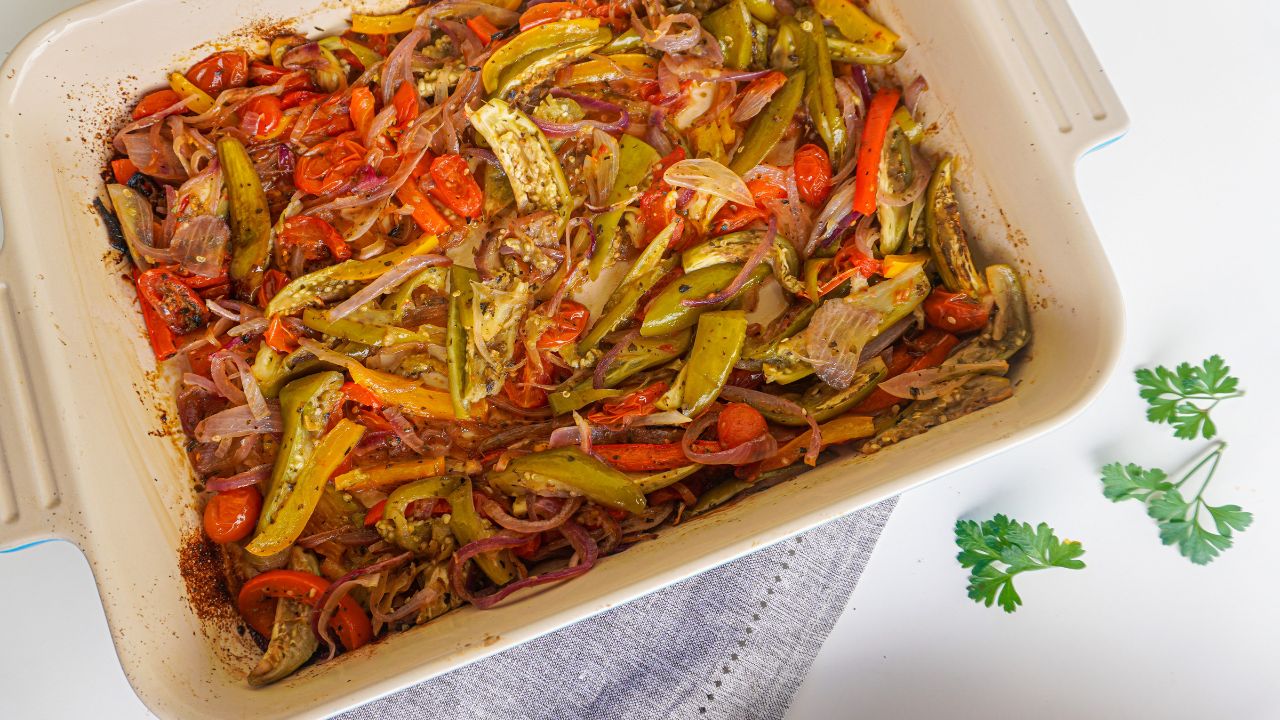 Sobrecoxa de frango com vegetais assados