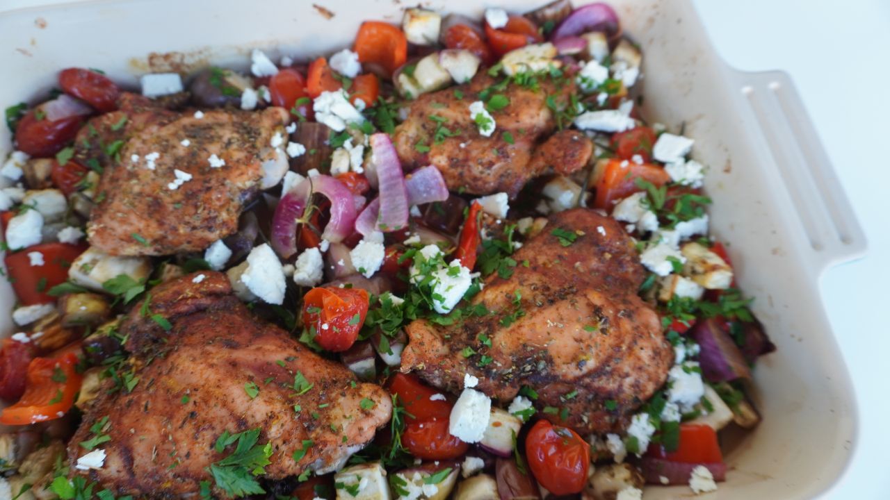 Jantar em uma assadeira só!? Sim ou com certeza? Essa é a minha receita preferida de sobrecoxa assada com vegetais. A marinada seca garante um frango assado bem suculento e o mix de vegetais resultam em um acompanhamento perfeito para o jantar.