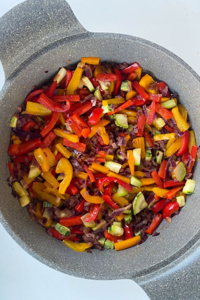 4. Em uma panela, coloque 1 colher de sopa de azeite. Adicione a cebola roxa, o pimentão amarelo e o pimentão vermelho. Salpique sal (vá temperando em camadas- fica mais fácil não errar a quantidade de sal). Mexa até que fiquem murchos. Acrescente a abobrinha. Reduza o fogo e mexa ocasionalmente até que a abobrinha esteja macia porém firme.