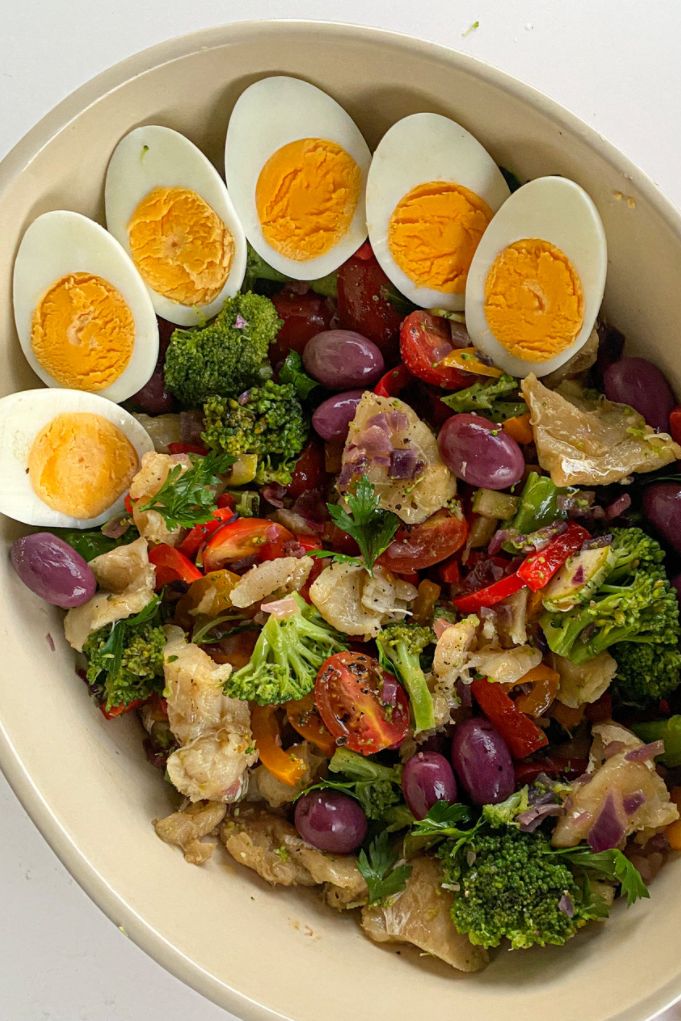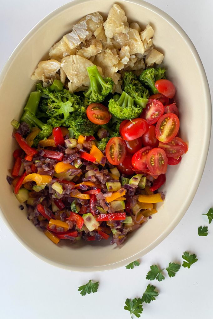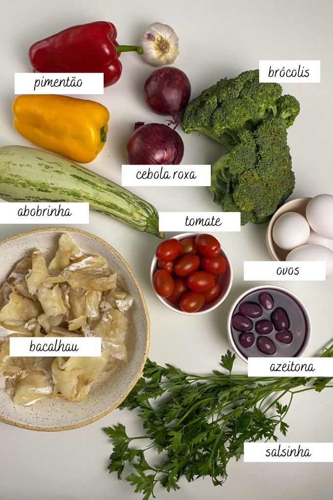 Nesta salada, vamos “pegar emprestado” os sabores tradicionais das saladas de bacalhau, mas vamos substituir a batata inglesa por doses extras de vegetais do grupo A (neste caso, a abobrinha e o brócolis).